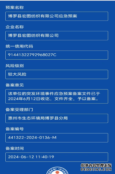 | 突發(fā)環(huán)境事件應急預案 | 已制訂《博羅縣宏圖紡織有限公司突發(fā)環(huán)境事件應急預案》,并于2024年 6月12日在惠州市生態(tài)環(huán)境局博羅分局備案,備案編號:441322-2024-0136-M |