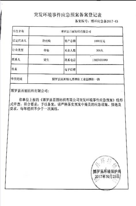 突發(fā)環(huán)境事件應(yīng)急預(yù)案    已制訂《博羅縣百麗紡織有限公司突發(fā)環(huán)境事件應(yīng)急預(yù)案》,并于2017年 10月25日在博羅縣環(huán)境保護(hù)局備案,
