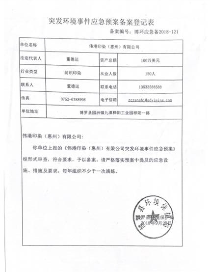 突發(fā)環(huán)境事件應(yīng)急預(yù)案    已制訂《偉港印染(惠州)有限公司突發(fā)環(huán)境事件應(yīng)急預(yù)案》,并于2025年 5月22日在博羅縣環(huán)境保護(hù)局備案,