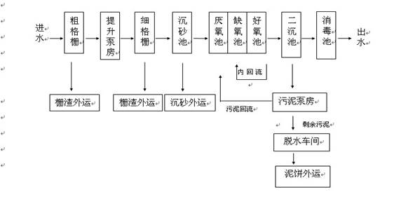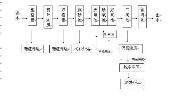 主要生產(chǎn)設(shè)備:粗格柵、潛水泵、細(xì)格柵、沉砂機、鼓風(fēng)機、微孔曝氣器、推流器、刮吸泥機、二氧化氯發(fā)生器、帶式污泥濃縮脫水機。