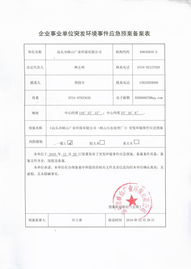 1、單位名稱: 汕頭市峽山廣業(yè)環(huán)保有限公司