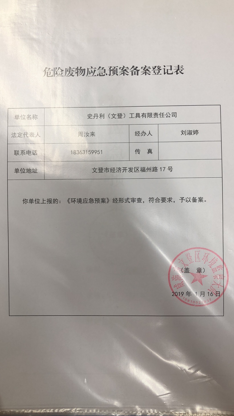 2、附件鏈接: 《史丹利(文登)工具有限責(zé)任公司危險廢物環(huán)境應(yīng)急預(yù)案備案表》
